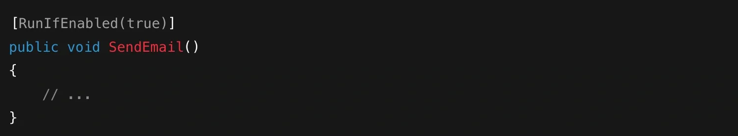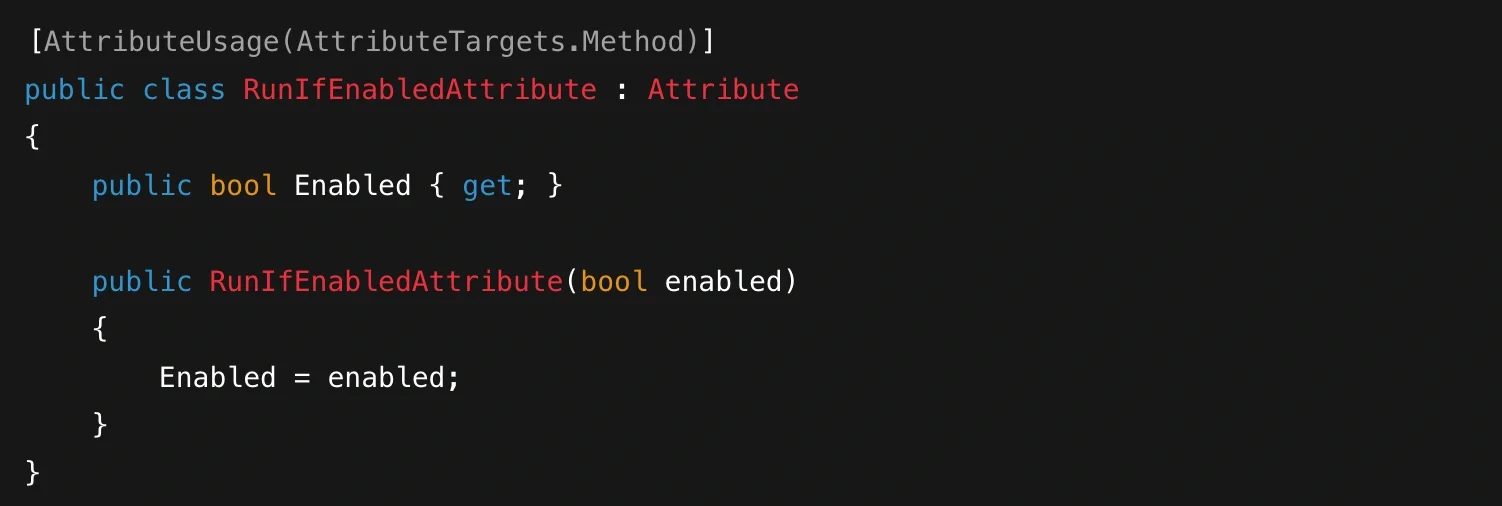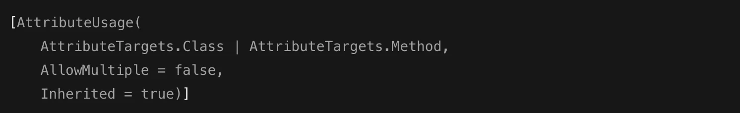 This declares an attribute that can be attached to methods. The [AttributeUsage] meta-attribute specifies where the attribute can be applied — in this case, only methods. You could then use it like this: