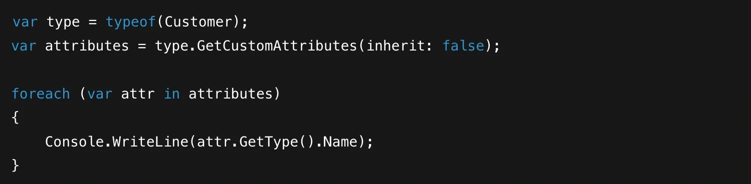 If your Customer class has [Serializable] applied, you’ll see SerializableAttribute printed out. This ability to inspect metadata at runtime is what makes attributes so powerful in frameworks and libraries. Frameworks like ASP.NET Core, NUnit, and Entity Framework all use reflection to scan your code and build behavior dynamically based on which attributes they find.