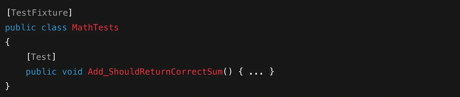 The testing engine scans assemblies for [TestFixture] and [Test] attributes, then executes the marked methods automatically. This is how thousands of tests can run without you manually invoking each one.