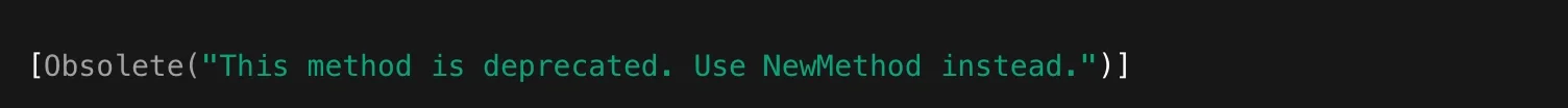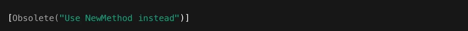 Here, the string you pass in is being sent to the constructor of the ObsoleteAttribute class. When your program runs, you can use reflection (part of the .NET runtime’s introspection tools) to retrieve that attribute instance and inspect its properties. That’s how frameworks can detect which methods to call or skip, which properties to serialize, and how to name things when interacting with external systems.