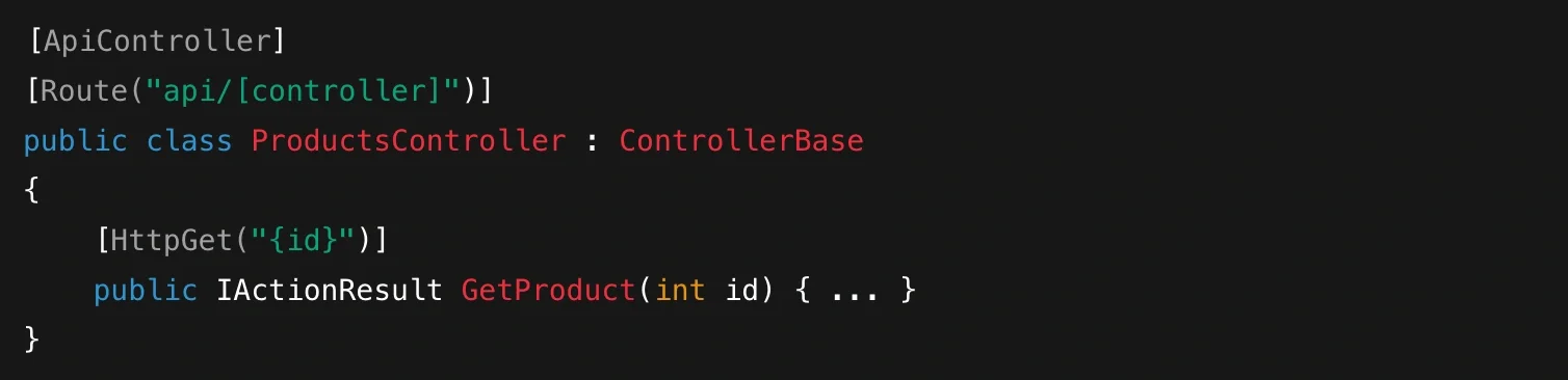 [ApiController]says, “This class handles HTTP requests and should use API conventions.”[Route("api/[controller]")]defines how URLs map to this controller.[HttpGet("{id}")]indicates which HTTP verb and route this method should respond to.