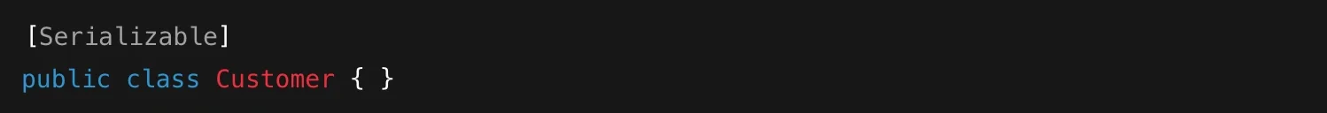 This doesn’t change what the Customer class does. The attribute simply tells the .NET runtime: “This class can be serialized” — meaning its data can be converted into a format suitable for storage or transfer. That’s the core idea. Attributes let you decorate code with extra information that other parts of your program, libraries, or frameworks can later read and react to.